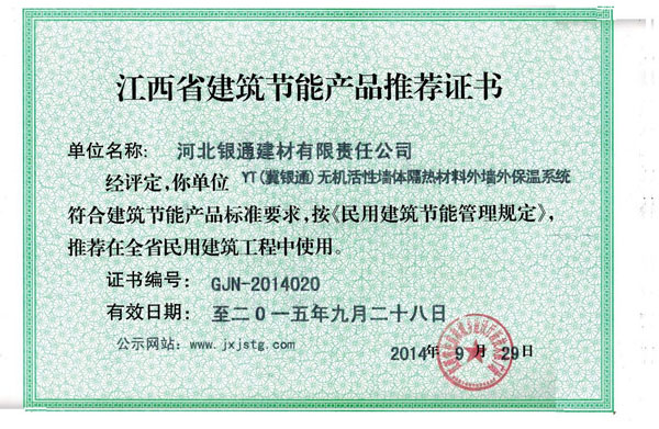 江西省建筑節能產品推薦證書